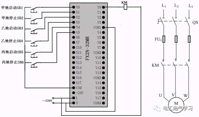 起动控制。在甲、乙、丙三个地点一起点击按钮SB1、SB3、SB5→线圈Y000得电→Y000常开自锁触点闭合,Y0端子的内部硬触点闭合→Y000线圈供电锁定,接触器线圈KM得电→主电路中的KM主触点闭合,电动机得电运转。