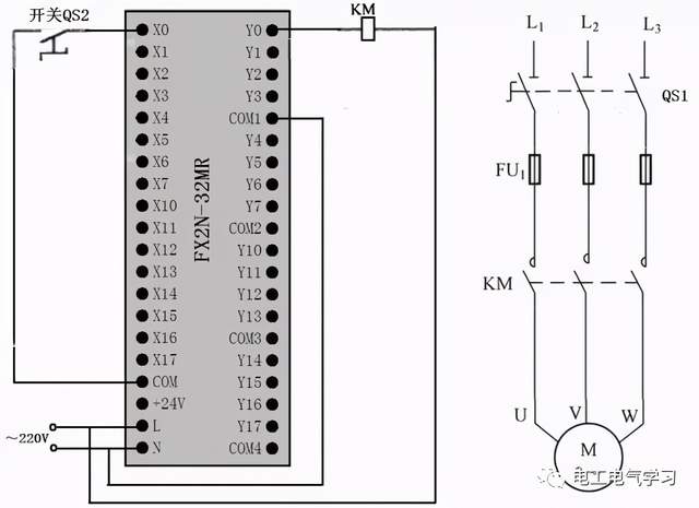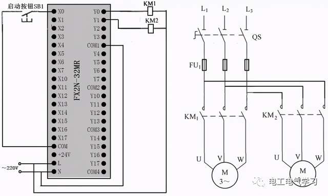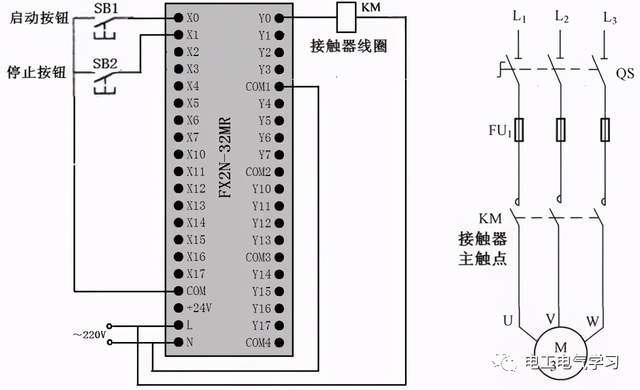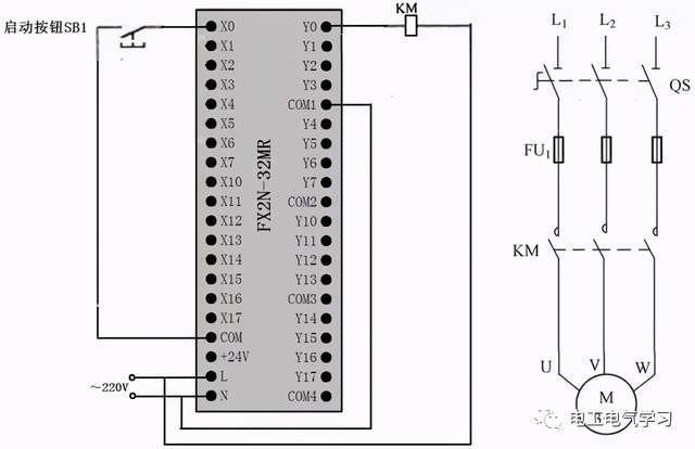 点击起动按钮SB1时,PLC内部梯形图程序中的起动触点X000闭合,输出线圈Y000得电,输出端子Y0内部硬触点闭合,Y0端子与COM端子之间内部接通,接触器线圈KM得电,主电路中的KM主触点闭合,电动机得电起动。