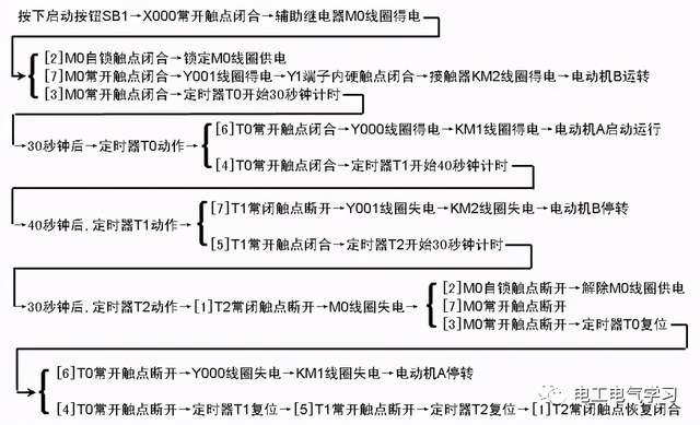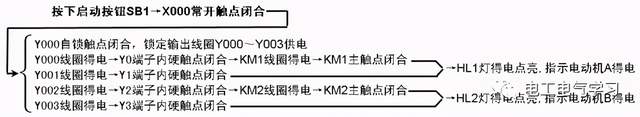 点击起动按钮SB1→[1]X001常开触点闭合→[SET Y001]指令执行→Y001线圈被置位,即Y001线圈得电→Y1端子内部硬触点闭合→接触器KM线圈得电→KM主触点闭合→电动机得电运转。