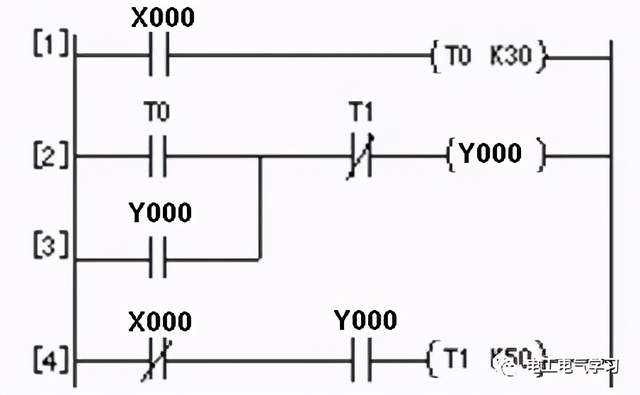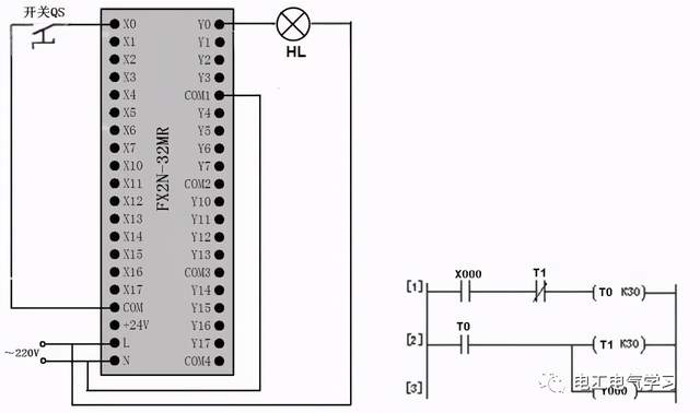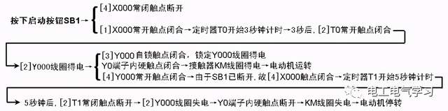 把开关QS闭合→X000常开触点闭合→定时器T0开始3s计时→3s后,定时器T0动作,T0常开触点闭合→定时器T1开始3s计时,与此同时Y000得电,Y0端子内部硬触点闭合,灯HL点亮→3s后,定时器T1动作,T1常闭触点断开→定时器T0复位,T0常开触点断开→Y000线圈失电,同时定时器T1复位→Y000线圈失电使灯HL熄灭;定时器T1复位使T1闭合,因为开关QS依旧是闭合状态,所以X000常开触点也是闭合,定时器T0又开始重新3s计时。
