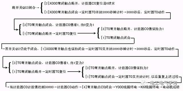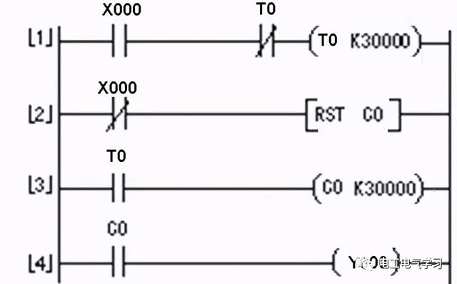 图中的定时器T0定时单位为0.1s(100ms),它与计数器C0搭配用之后,它的定时时间T=30000×0.1秒×30000=90000000秒=25000小时。如果需要重新定时,可以把开关QS2断开,让[2]X000常闭触点闭合,然后“RST C0”指令执行,之后计数器C0进行复位,然后再闭合QS2,就会重新开始250000小时定时。