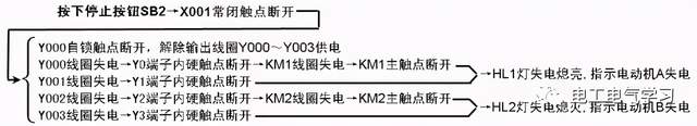 点击停止按钮SB2→[2]X002常开触点闭合→[RST Y001]指令执行→Y001线圈被复位,即Y001线圈失电→Y1端子内部硬触点断开→接触器KM线圈失电→KM主触点断开→电动机失电停转。