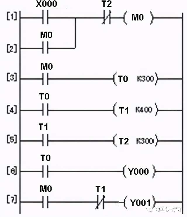 2、多定时器组合控制的PLC线路与梯形图