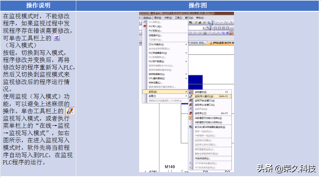 在线监视PLC程序的运行 在works2软件中将程序写入PLC后,如果希望看见程序在实际PLC中的运行情况,可使用软件的在线监视功能,该功能使用时,应确保PLC与计算机间通信电缆连接正常,PLC供电正常。