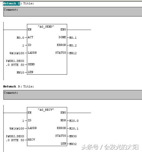 到此为止,系统的硬件组态和网络配置已经完成。下面进行系统的软件编制,在SIMATIC Manager界面中,分别在CPU314C-2PTP、CPU314C-2DP中插入OB35定时中断程序块和数据块DB1,DB2,并在两个OB35中调用FC5(AG_Send)和FC6(AG_Recv)程序块,如下图: