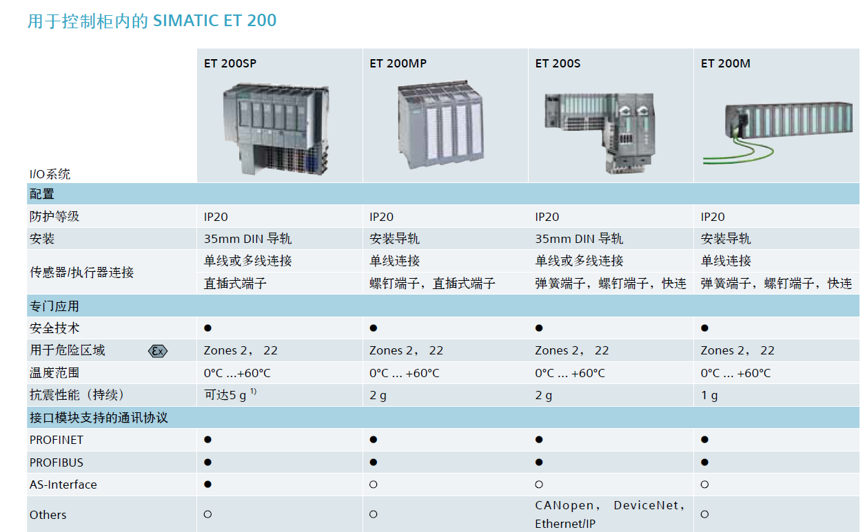 SIMATIC ET 200家族成员众多,有用于柜内控制,防护等级为IP20的ET 200S、ET 200SP、ET 200M、ET 200MP;以及不需要控制柜,防护等级在IP65以上的ET 200eco、ET 200AL、ET 200pro等产品。本文会对以上产品进行逐一介绍。