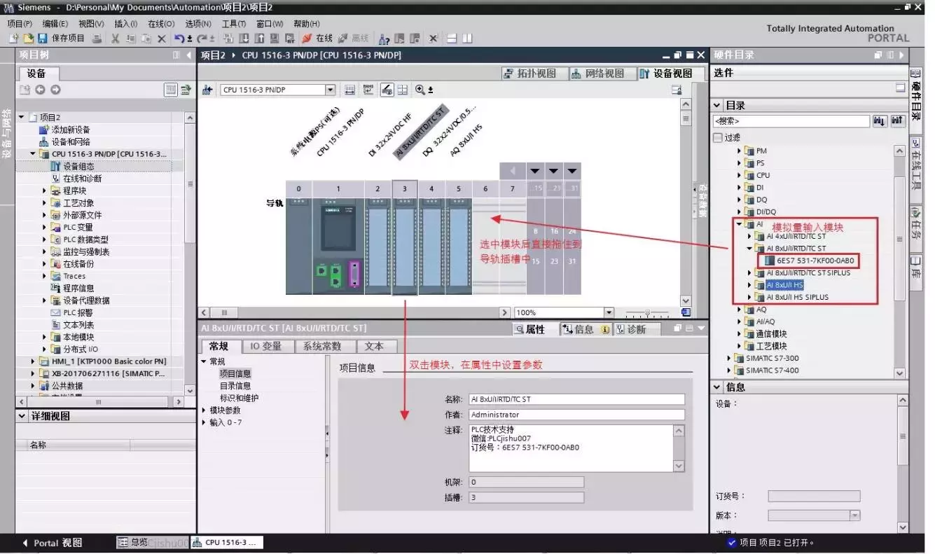 S7-1500系列,模拟量输入(AI)模块参数配置 1、添加模块 添加模块与数字模块操作方式一样,直接拖拽或者选择好卡槽后双击模块。 ||点击图片可放大|| 2、模块种类 一个模拟量输入模块最多可以输入8路模拟量信号,每一路可以连接不同的传感器。为了匹配不同传感器的接线方式,需要在模块上配置相应的参数,参数与传感器不匹配,采集到的信号会不准确。 本文以AI8xU/I/RTD/TC ST(6ES7531-7KF00-0AB0)为例讲解模块参数设置。6ES7 531-7KF00-0AB0是最常用的模拟量输入模块,可以输入电流,电压,热电阻,热电偶,电阻信号,但是用作电阻/热电阻测量时只有4通道,不建议使用该模块测量电阻信号。 3、常规信息 常规选项主要用于标注模块的基本信息,各种模块以及CPU中的常规信息都是相同的,需要了解的可以点击下列文章复习。 4、通道参数 同数字量模块一样,可以通过组态“通道模板”进行设置通道参数,当然也可以手动单独组态各个通道。 这里以手动组态各个通道为例,讲解参数设置。 上图中需要设置的参数比较多,一般情况只需要设置好“测量类型”和“测量范围”模块就能正常使用了,关于诊断和硬件中断这里不做介绍了,用到相关配置时可以自己查阅相手册。 有时候一个8路的输入模块,我们值用到其中几路,对于未使用的通道,测量类型最好选择禁用设置,这样在通道的A-D转换时间被设置为0S。 S7-1500中可以直接设置每一个通道的测量类型和测量范围,而不必像S7-300/400那样每两个通道一组。