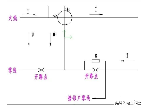 例1、某单相用户电表为直接接入式,偷电时断开进表零线,而将出表零线串入一个高阻值的电阻,然后接到邻户的零线,其接法如下图: