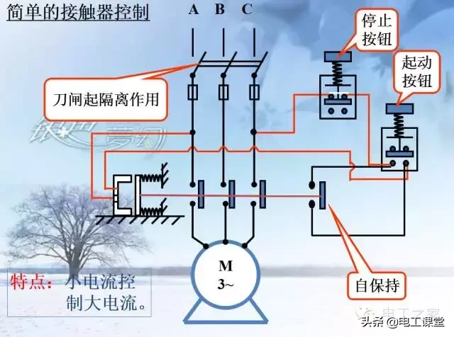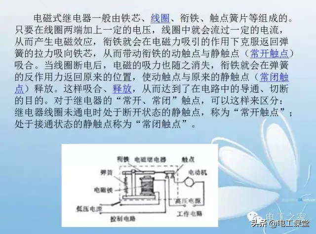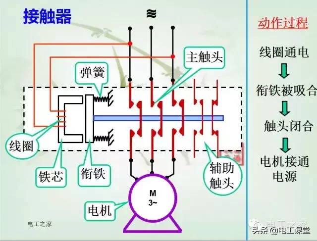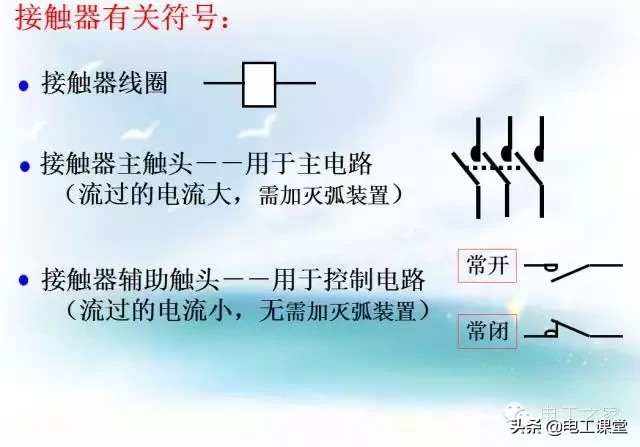 4、接触器(Contactor)的功能说明 交流接触器利用主接点来开闭电路,用辅助接点来导通控制回路。主接点一般是常开接点,而辅助接点常有两对常开接点和常闭接点,小型的接触器也经常作为中间继电器配合主电路使用。交流接触器的接点,由银钨合金制成,具有良好的导电性和耐高温烧蚀性。 交流接触器动作的动力源于交流通过带铁芯线圈产生的磁场,电磁铁芯由两个「山」字形的幼硅钢片叠成,其中一个固定铁芯,套有线圈,工作电压可多种选择。为了使磁力稳定,铁芯的吸合面加上短路环。交流接触器在失电后,依靠弹簧复位。另一个是活动铁芯,构造和固定铁芯一样,用以带动主接点和辅助接点的闭合断开。 20安培以上的接触器加有灭弧罩,利用电路断开时产生的电磁力,快速拉断电弧,保护接点。 接触器具可高频率操作,做为电源开启与切断控制时﹐最高操作频率可达每小时1200次。 接触器的使用寿命很高﹐机械寿命通常为数百万次至一千万次,电寿命一般则为数十万次至数百万次。 5、接触器(Contactor)的触头接触不牢靠的原因及处理方法 触头接触不牢靠会使动静触头间接触电阻增大,导致接触面温度过高,使面接触变成点接触,甚至出现不导通现象。造成此故障的原因有: (1)触头上有油污、花毛、异物。 (2)长期使用,触头表面氧化。 (3)电弧烧蚀造成缺陷、毛刺或形成金属屑颗粒等。 (4)运动部分有卡阻现象。 处理方法有: (1)对于触头上的油污、花毛或异物,可以用棉布蘸酒精或汽油擦洗即可。 (2)如果是银或银基合金触头,其接触表面生成氧化层或在电弧作用下形成轻微烧伤及发黑时,一般不影响工作,.可用酒精和汽油或四氯化碳溶液擦洗。即使触头表面被烧得凸凹不平,也只能用细锉清除四周溅珠或毛刺,切勿锉修过多,以免影响触头寿命。 对于铜质触头,若烧伤程度较轻,只需用细锉把凸凹不平处修理平整即可,但不允许用细砂布打磨,以免石英砂粒留在触头间,而不能保持良好的接触;若烧伤严重,接触面低落,则必须更换新触头。 (3)运动部分有卡阻现象,可拆开检修。 6、接触器结构说明 交流接触器利用主接点来开闭电路,用辅助接点来导通控制回路。 主接点一般是常开接点,而辅助接点常有两对常开接点和常闭接点,小型的接触器也经常作为中间继电器配合主电路使用。 交流接触器动作的动力源于交流通过带铁芯线圈产生的磁场,电磁铁芯由两个「山」字形的幼硅钢片叠成,其中一个固定铁芯,套有线圈,工作电压可多种选择。为了使磁力稳定,铁芯的吸合面加上短路环。交流接触器在失电后,依靠弹簧复位。