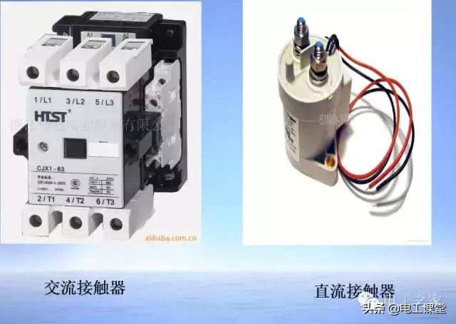 接触器 1、接触器(Contactor)的工作原理 接触器是指工业电中利用电流流过线圈产生磁场,使触头闭合,以达到控制负载的电器。接触器由电磁系统(铁心,静铁心,电磁线圈)触头系统(常开触头和常闭触头)和灭弧装置组成。其原理是当接触器的电磁线圈通电后,会产生很强的磁场,使静铁心产生电磁吸力吸引衔铁,并带动触头动作:常闭触头断开;常开触头闭合,两者是联动的。当线圈断电时,电磁吸力消失,衔铁在释放弹簧的作用下释放,使触头复原:常闭触头闭合;常开触头断开. 在工业电气中,接触器的型号很多,电流在5A-1000A的不等,其用处相当广泛。 在电工学上,接触器是一种用来接通或断开带负载的交直流主电路或大容量控制电路的自动化切换器,主要控制对象是电动机,此外也用于其他电力负载,如电热器,电焊机,照明设备,接触器不仅能接通和切断电路,而且还具有低电压释放保护作用。接触器控制容量大。适用于频繁操作和远距离控制。是自动控制系统中的重要元件之一。 2、接触器(Contactor)的分类 通用接触器可大致分以下两类: 1、交流接触器。主要有电磁机构。触头系统。灭弧装置等组成。常用的是CJ10。CJ12。CJ12B等系列。 2、直流接触器,一般用于控制直流电器设备,线圈中通以直流电,直流接触器的动作原理和结构基本上与交流接触器是相同的。 因为可快速切断交流与直流主回路和可频繁地接通与大电流控制(某些型别可达800安培)电路的装置,所以经常运用于电动机做为控制对象﹐也可用作控制工厂设备﹑电热器﹑工作母机和各样电力机组等电力负载,并作为远距离控制装置。