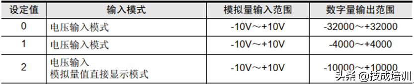 上图是我们FX系列的PLC,加了2个模拟量的模块,其中FX3U-4AD就是用来接收这些电压数值的模块(也可以接收电流)。有一点要记住,plc显示出来的是数字,而不是电压值。而且,显示出来的数值大小也可以是不同范围,例如,可以把0-10V的电压显示为0-10000的数值,也可以显示为0-4000或者0-32000的对应数值,你选择的数值越大,检测的就越精确,看下图的3种模式,我们可以通过plc编程进行设定,选择其中一种: