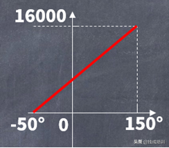 我们把读取的数值命名为y把实际温度命名为x,x变化,我们的y也会跟着变化,这时,因为我们的温度初始检测值不为零,所以计算比前面有所不同。我们先根据-50°对应数值0, +150°对应的数值为16000,做出下图