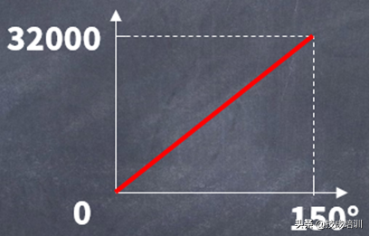 如上图,温度和读取的数值是一个线性关系,我们可以用坐标系表示,温度为X,显示的数值为Y,这时我们发现,他们之间存在一个比例关系,Y是X的k倍,也就是说,显示的数值是实际温度的K倍,具体是多少倍,我们不知道,我们可以列公式 y=k*x,这时可以代入 x=150°时,y=32000,即 32000=k*150,可以求得,k=32000/150=2133