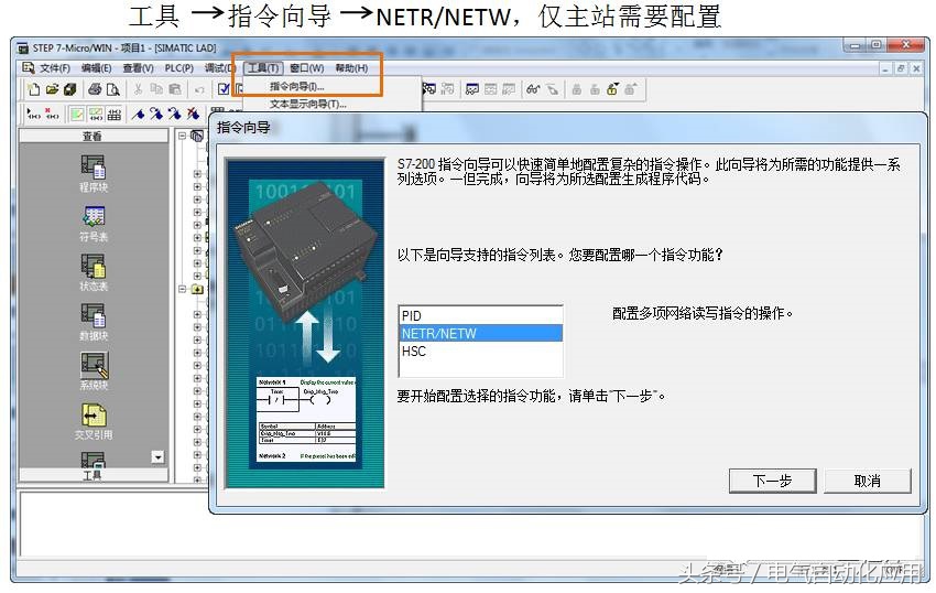我们打开S7-200编程软件,点击'工具'下拉菜单,选择指令向导,在指令向导中选择网络读写向导,然后点击下一步(如图1);