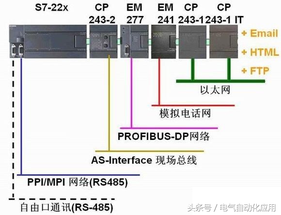 首先,这里对S7-200通讯性能做一个整体介绍,请看CPU200和扩展模块示意图(上图),CPU200会集成1~2个RS485通讯口,集成的通讯口可以实现PPI、MPI和自由口通讯,在自由口方面,西门子 已经为客户开发Modbus RTU主站和从站通讯指令库-USS通讯指令库。CPU200后的第一个扩展模块是CP243-2,是ASI主站通讯模块,使用两个槽位资源,支持的协议版本是2.1版本。第二个扩展模块是EM277,是标准的PROFIBUS DP从站通讯模块,EM277后面的EM241模块是一个模拟的电话调制解调器模块。最后两个模块CP243-1、CP243-1IT是以太网通讯扩展模块,支持西门子内部的S7协议,目前已经有新一代的CP243-1模块来代替之前的两个模块。CP243-1的IT功能主要包括Email、HTML和FTP三种。
