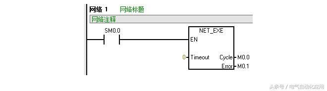 向导生成的'NET_EXE'需要在主程序中用SM0.0持续调用,子程序的'Timeout'输入管脚是超时参数管脚,如果通讯中遇到问题,等待时间超过此延时时间,'NET_EXE'子程序会报错,在这里(下图)填0表示不启动延时检测,我们可以以秒为单位指定延时检测时间,有效数据范围为1-36767。