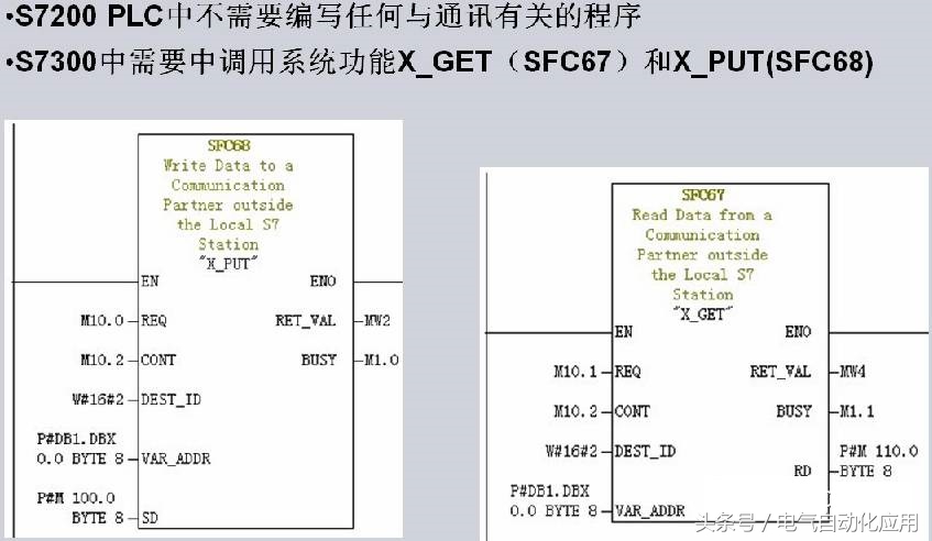 S7-200与S7-300之间采用MPI通讯时,S7-200PLC不需要编写任何与通讯有关的程序,只需要将要交换的数据整理到一个连续的V存储区当中即可。而在S7-300PLC中需要在程序中调用系统功能'X_GET'(SFC67)和'X_PUT'(SFC68),每次读或者写操作由SFC的功能管脚'REQ'输入的1信号触发,'DEST_ID'是指S7-200PLC的MPI地址,在本例子中(上图)是2。S7-200的V存储区被S7-300PLC看作是DB1,因此在远程数据地址输入管脚'VAR_ADDR'我们填写的'P#DB1.DBX0.0 BYTE 8'即是从S7-200PLC VB0开始的8个字节,'SD'和'RD'指向的是S7-300内部的数据存储区,在本例子中使用的都是M存储区。