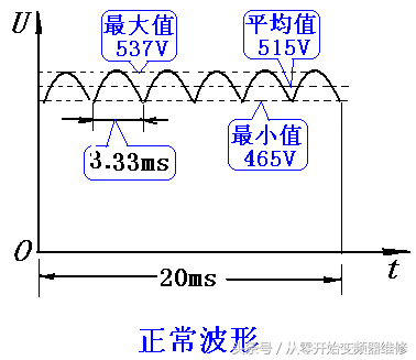 1)正常情况 当变频器正常工作时,直流母线上的电压 如图所示,一个工频周期内将有6个波头,此时直流电压 的最大值为537V,平均值为515V,最小值465V。对于一个7.5KW的变频器,其滤波电容容量一般为900 ,当满载运行时,电压降落大约为40V,即平均电压为500V左右。当滤波电容容量下降,满载时平均电压会低于500V。