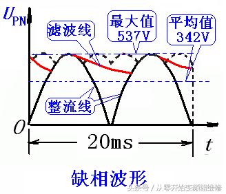 2)缺相情况 当输入缺相时,一个周期内只有2个电压波头,且整流电压最低值为零。此时电压的平均值为342V,比正常情况低了170V。但当空载时,因为有滤波电容,仍可使直流母线上电压达到500V以上。当变频器一带载,电压随负载的增加迅速下降,当频率上升到十几Hz,电压下降到400V以下。最好的判断方法是用电压表测量开机时直流母线电压的下降情况。