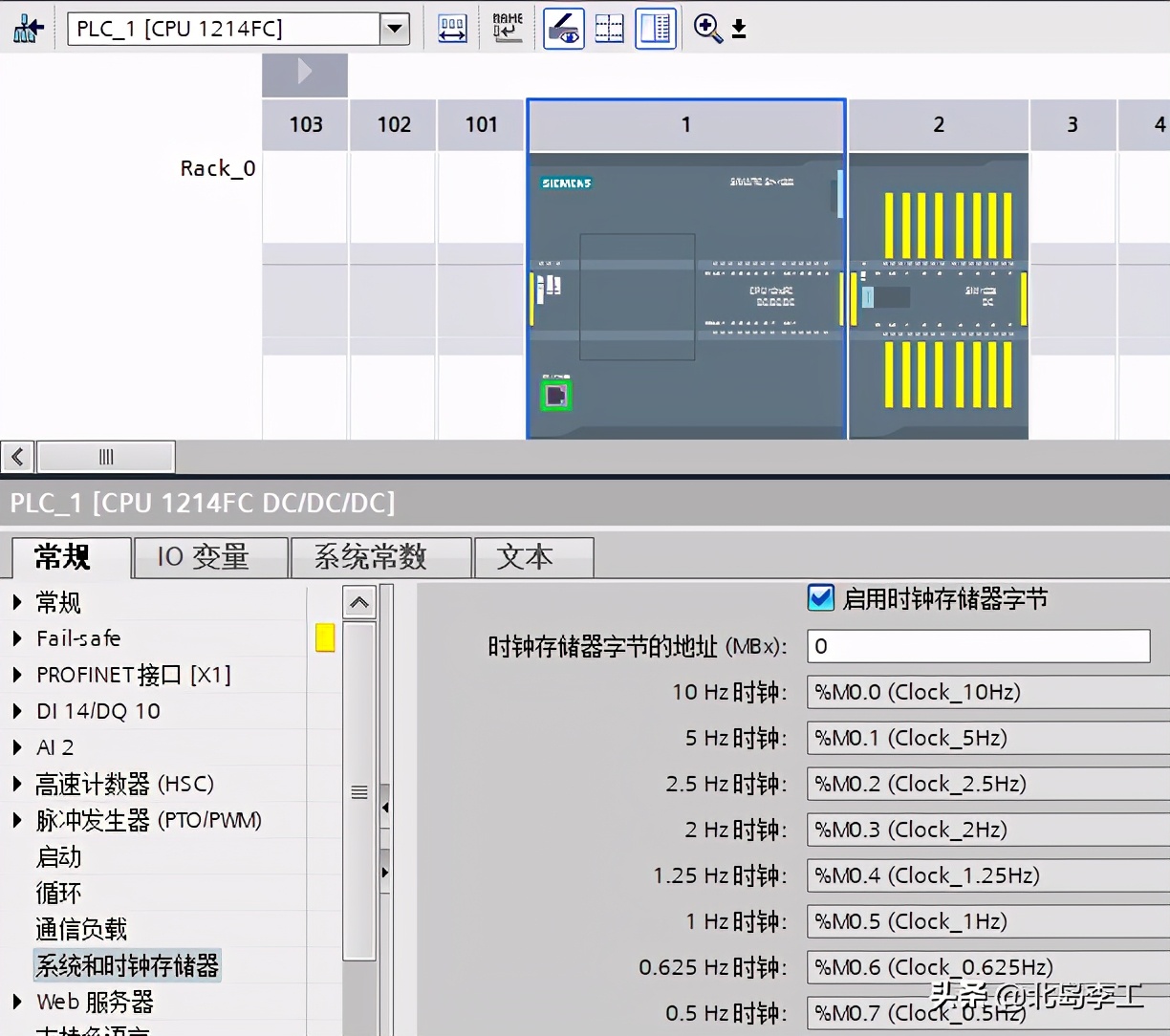 1、CPU的时钟脉冲 CPU的时钟脉冲可以产生8个不同频率的脉冲信号(占空比1:1)。在CPU的硬件组态中找到【系统和时钟存储器】,勾选【启用时钟存储器字节】,在时钟存储器字节的地址中输入位存储器的地址(默认为MB0),那么CPU的硬件(严格来说是操作系统)会将相应频率的脉冲写入到该位存储器字节的相应位。比如下面这张图:M0.1是5Hz的时钟脉冲,M0.5是1Hz的时钟脉冲。