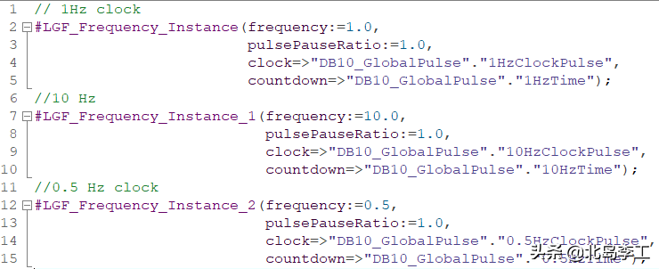这种通过函数块和数据块实现的脉冲信号提高了程序的可读性,并且能产生任意需要的周期及占空比的脉冲信号,缺点是需要手动编程,相比CPU的脉冲信号复杂一点; 说明:其实之前介绍过LGF_Frequency及通用函数库,可以看看文章:博途扩展函数库LGF系列教程(1)-LGF_Frequency 来源:北岛李工(头条)