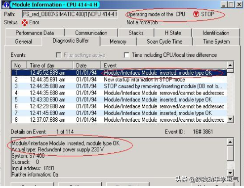 再当掉电模块掉电恢复后,CPU仍为停机不恢复,查看诊断信息显示是模块插入恢复,如下图所示: