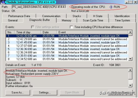 4、在冗余电源配置中,电源模块掉电,调用哪个OB可以防止CPU停机? 通常我们可容易以为OB81就是处理所有电源故障的OB块,但对于冗余电源配置中,某个电源模块掉电故障,实际上CPU当做模块插拔故障来处理,因此需要调用OB83。 如下图所示:当程序中没有插入OB83时,电源模块掉电,CPU会停机,查看诊断信息,显示为模块插拔故障导致停机。