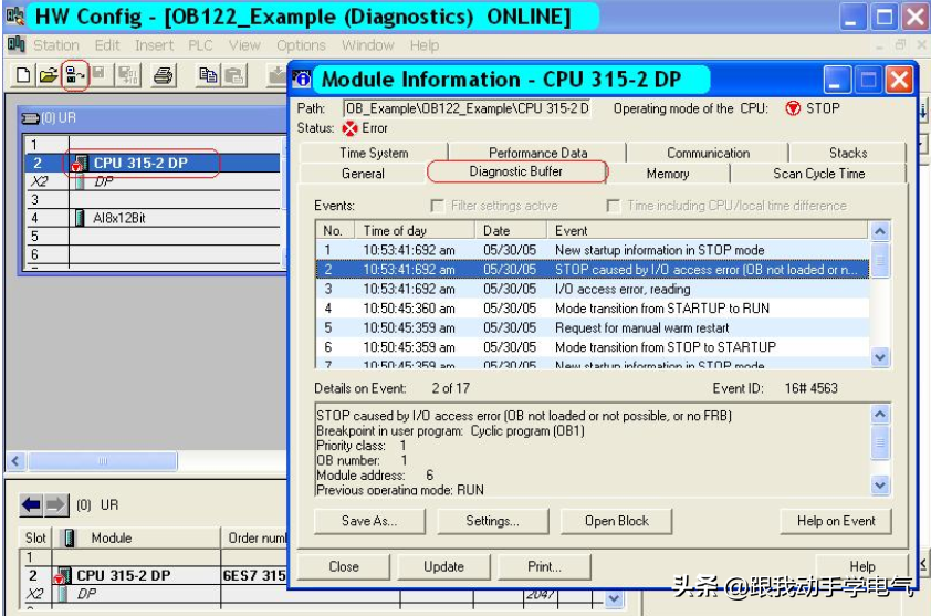 1、CPU的SF红灯亮,CPU停机是什么原因造成的? 当SF灯亮,CPU停机后不知道是什么原因造成的,这时该怎么办呢? 我们需要去查看CPU的诊断缓冲区,根据诊断缓冲区中提供的停机信息来采取相应的措施,比如:需要OB82、OB86组织块下载等。那么怎么查看CPU诊断缓冲区呢? 方法一:首先连接到你的CPU,然后打开硬件组态,选择ONLINE,然后双击CPU,选在Diagnostic Buffer选项,就可以查看CPU的故障信息,可参见下图所示: