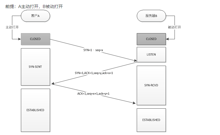 - A收到确认连接请求后,ACK置1,确认号ack=y+1,seq=x+1,进入到ESTABLISHED(已建立连接)状态。向B发出确认连接,最后B也进入到ESTABLISHED(已建立连接)状态。