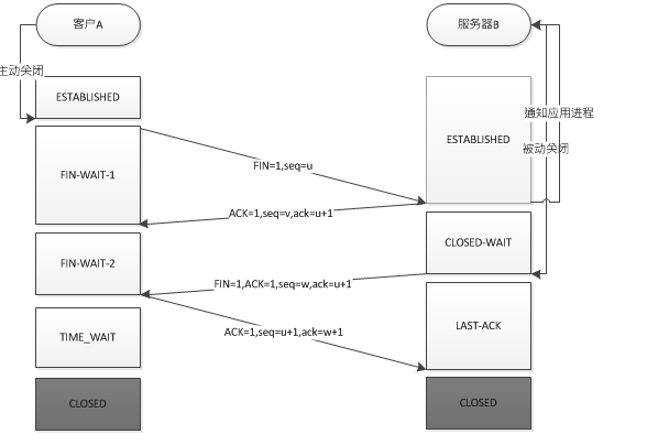 - B收到FIN后,发送一个ACK给A,确认序号为收到序号+1(与SYN相同,一个FIN占用一个序号),B进入CLOSE_WAIT状态。