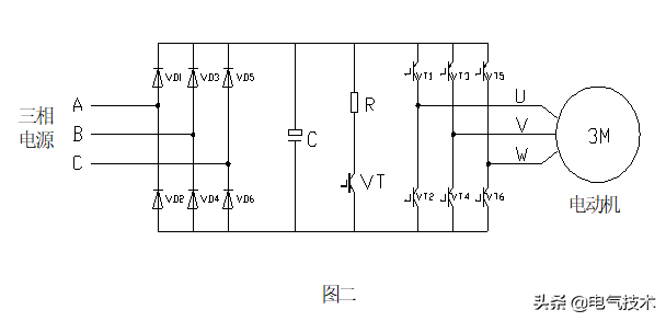 电压型变频器的主回路如图2,图中,整流元件为二极管组成,逆变元件采用绝缘栅晶体管组成。该类变频器结构简单,技术成熟,在低压通用型变频器中被广泛采用,其缺点是不能四象限运行。 (本文选编自《电气技术》,原文标题为“浅谈低压通用变频器的应用和选型”,作者为罗庆祝。)