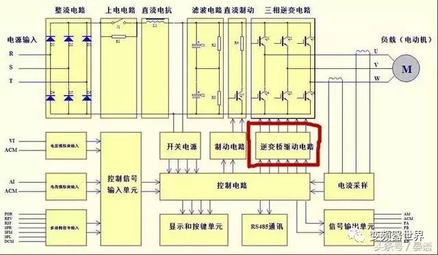 从上图中,我们可以看出上半部分是主电路结构图,而下半部分是控制电路,控制电路的功能就是生产逆变电路需要的6路脉冲信号,除此之外,控制电路还负责主电路的电流电压检测、故障检测、停机保护、操作控制、实施显示和通讯等任务。