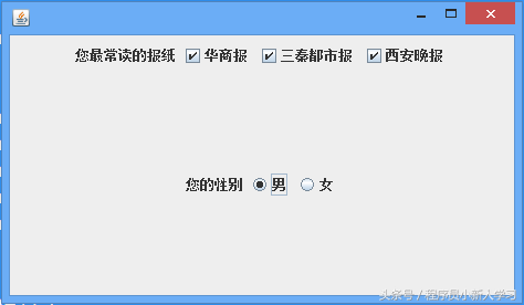 具体代码: 1 import javax.swing.ButtonGroup; 2 import javax.swing.JCheckBox; 3 import javax.swing.JFrame; 4 import javax.swing.JLabel; 5 import javax.swing.JPanel; 6 import javax.swing.JRadioButton; 7 8 import java.awt.*; 9 10 public class diaocha extends JFrame{ 11 JCheckBox jcb1,jcb2,jcb3; 12 JRadioButton jrb1,jrb2; 13 JLabel jLabel1,jLabel2; 14 JPanel jp1,jp2; 15 public diaocha(){ 16 jcb1 = new JCheckBox("华商报"); 17 jcb2 = new JCheckBox("三秦都市报"); 18 jcb3 = new JCheckBox("西安晚报"); 19 jrb1 = new JRadioButton("男"); 20 jrb2 = new JRadioButton("女"); 21 jLabel1 = new JLabel("您最常读的报纸"); 22 jLabel2 = new JLabel("您的性别"); 23 jp1 = new JPanel(); 24 jp2 = new JPanel(); 25 //设置布局 26 this.setLayout(new GridLayout(2, 1)); 27 //添加组件 28 jp1.add(jLabel1); 29 jp1.add(jcb1); 30 jp1.add(jcb2); 31 jp1.add(jcb3); 32 jp2.add(jLabel2); 33 //现在这样的话,最后还是会对性别进行全部选择的。所以添加按钮对象,对同一组单选按钮惊醒分组 34 ButtonGroup bGroup = new ButtonGroup(); 35 bGroup.add(jrb1); 36 bGroup.add(jrb2); 37 jp2.add(jrb1); 38 jp2.add(jrb2); 39 this.add(jp1); 40 this.add(jp2); 41 42 //设置展示面板 43 this.setVisible(true); 44 this.setDefaultCloseOperation(JFrame.EXIT_ON_CLOSE); 45 this.setSize(200, 200); 46 } 47 public static void main(String[] args){ 48 new diaocha(); 49 } 50 }