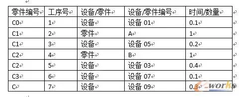 例如C1工序既涉及到加工,又涉及到组装。如果该工序号后面写的是零件,则该步骤为装配,后面是装配使用的数量。如果工序号后面是设备,则后面是具体设备编号,和在该设备上加工使用的时间。通过该表就可以表示出流程中既有装配,又有组装的复杂流程。