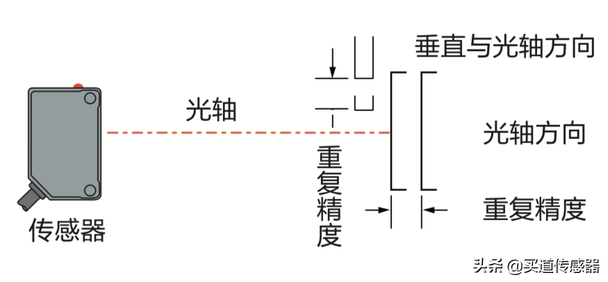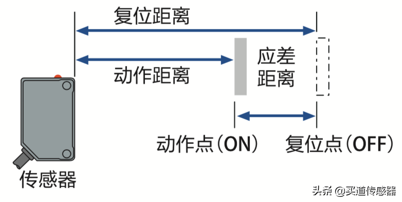 检测物从远到近靠近传感器直到输出变为ON的位置为动作距离,从此位置往外移动直到输出变为OFF的位置为复位距离。应差距离=复位距离-动作距离