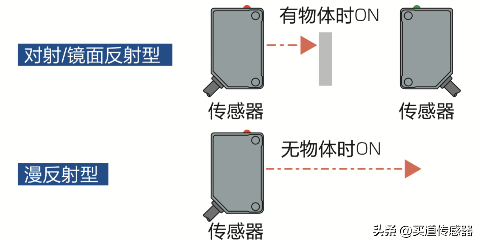 对射型/镜反射型传感器有物体时输出ON;漫反射型传感器无物体时ON