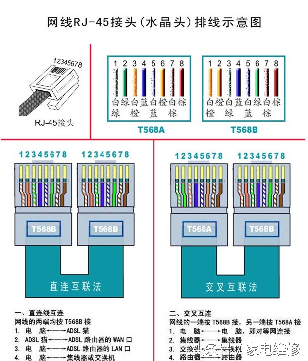 准备好工具,原料 1、具有8P槽的压线钳 接着我们使用网线钳的剥皮功能剥掉外皮约2cm即可,这时我们可以看见彩色互相缠绕的橙、蓝、绿、棕、白橙、白绿、白蓝、白棕。我们摆放顺序为:白橙、橙、白绿、蓝、白蓝、绿、白棕、棕,推荐使用这个方法,比较通用,适合电脑与路由器、拨号猫、交换机。 摆好位置之后将网线摆平捋直,使用切线刀将其切齐,切线刀通常的网线钳都有,一定要确保切的整齐,然后平放入水晶头,使劲儿往前顶,当从水晶头的前放都看到线整齐的排列之后,使用网线钳子的水晶头压制模块将其挤压。 网线有两种接法: 第一种、 直连线接法(平行线接法):相同设备,使用直连线接法,即:两端都是TIA/EIA-568A标准或TIA/EIA-568B标准。 网线两头接法都是:白橙、橙、白绿、蓝、白蓝、绿、白棕、棕 第二种、 交叉线接法:相同设备,使用交叉线接法,即:一端是TIA/EIA-568A标准, 另一端是TIA/EIA-568B标准。 网线一端接法是白绿、绿、白橙、蓝、白蓝、橙、白棕、棕。另一头接法是:白橙、橙、白绿、蓝、白蓝、绿、白棕、棕 两种方法都可以,在此我推荐使用直连线方法,因为简单,网线两头接线法也都是一样的,都是白橙、橙、白绿、蓝、白蓝、绿、白棕、棕。