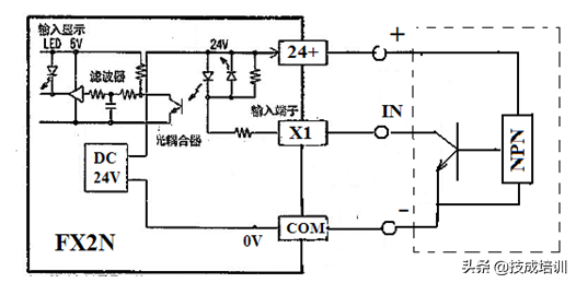 这是发光二极管D2在外接电源下导通,经光电耦合滤波将信号送入PLC内部控制电路,其电流回路留给大家自己去分析。 不同PLC的输入电路是不尽相同的。目前,很多PLC例如三菱FX3U,台达EX,ES等都具有二种接入方式,即所谓的源型(Source)和漏型(Sink)模式,其优点是利用内部24V电源,既可以接入NPN型,也可以接入PNP型开关。而不必外加电源。 来源:技成培训