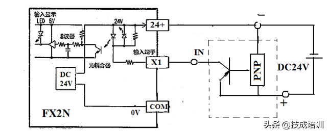 当有多个有源开关接入时,开关正极均接FX2N的24+端,负极接输入公共端COM,而开关的1N端则分别接入各个X的输入端子。数量太多时,还必须核算,FX2N的内部电源24V的容量不能小于有源开关的容量之和。否则,必须外加24V电源给有源开关供电。 FX2N在外接电源的情况下,也可以用PNP型集电极输出传感开关,其接入如下图所示。