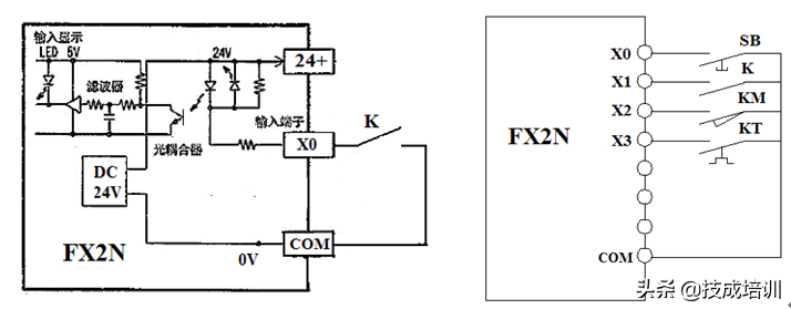 从图中电路可以看出,FX2N的输入电路是二个方向相反的发光二极管D1和D2并接所组成的光电耦合器输入电路,经过滤波器送入PLC内部控制电路。 输入电路的作用是把外部的开关量信号状态送入PLC。外部开关量信号有2种,一种是无源信号,例如按钮,继电器触点,各种行程开关,手动开关等。其接入如下图。