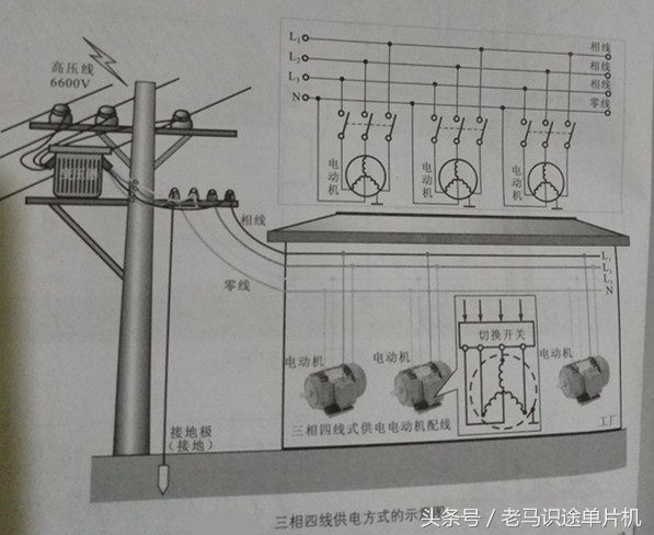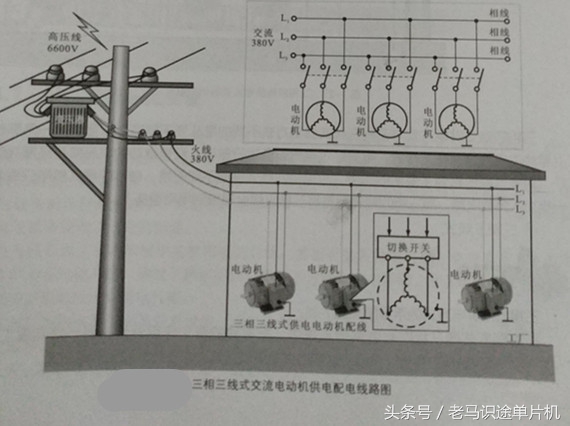 高压(6000V或10000V)经变压器变压后,由变压器引出三根线,送入工厂用电设备,每根相线之间电压为380V,