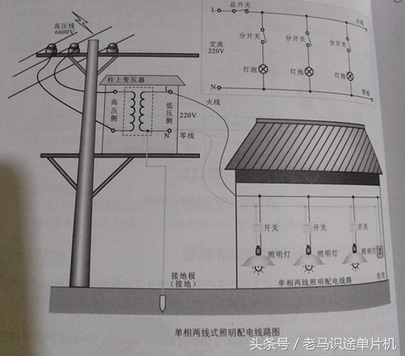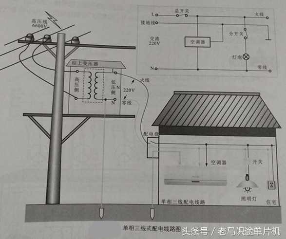 从三相三线高压电线上取其中的两线送入高压变压器,变压后(降压,如由高压6600V变为220V)向家庭照明线路提供220V电压,变压器初级与次级隔离,输出端火线与零线之间的电压为220V。