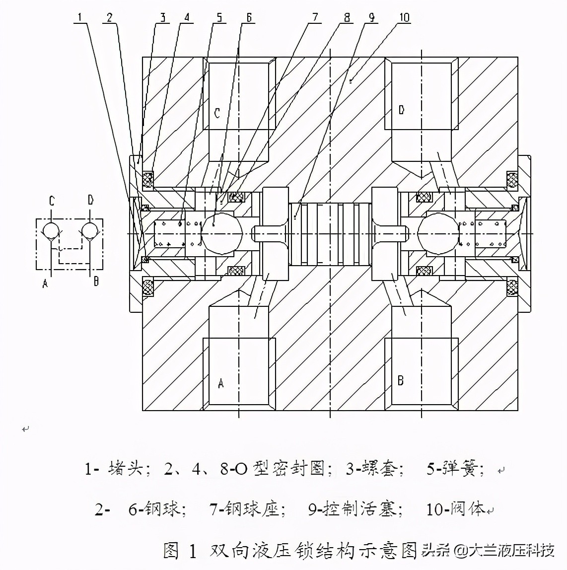 1、概述 双向液压锁和平衡阀组在一定场合下都能作为闭锁元件使用,可以保证工作装置不会因自重等外部原因出现下滑、超速或串动。但在一些特定速度载荷的情况下,却不能互换使用,下面针对两种产品的结构特点,大兰液压小编给大家介绍一下。 2、双向液压锁的结构特点: 双向液压锁是两个液控单向阀并在一起使用的(见图1),通常使用在承重液压缸或马达油路中,用于防止液压缸或马达在重物作用下自行下滑,需要动作时,须向另一路供油,通过内部控制油路打开单向阀使油路接通,液压缸或马达才能动作。 由于该产品结构本身的原因,液压缸运动过程中,由于负载的自重,往往在主工作腔造成瞬间失压,产生真空,面使单向阀关闭,然后继续供油,使得工作腔压力上升再开启单向阀。由于频繁地发生打开关闭动作,而会使负载在下落的过程中产生较大的冲击和振动,因此,双向液压锁通常不推荐用于高速重载工况,而常用于支撑时间较长,运动速度不高的闭锁回路。  双向液压锁结构示意图