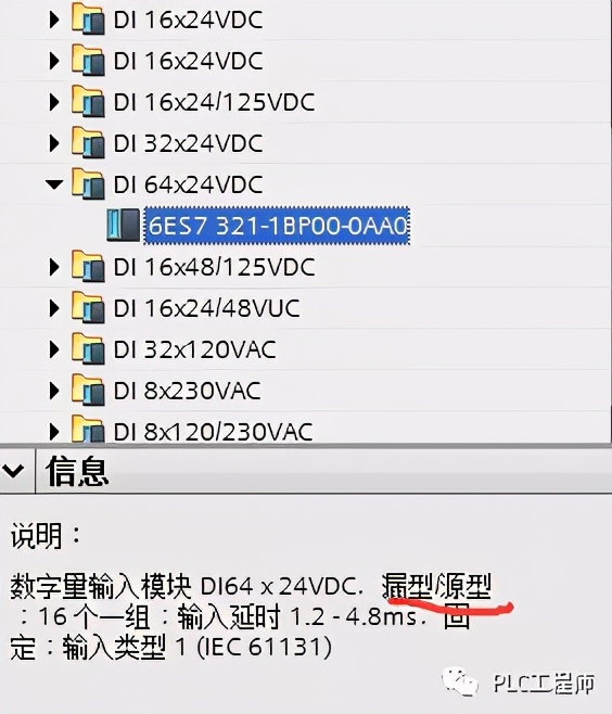 (1)S7-300的大部分DI模块均为漏型(应该选取PNP型的传感器),在硬件组态时不提示源型还是漏型,就是默认为漏型的意思,如:321-1BL00: