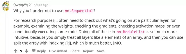 还有用户表示:「为什么不使用 nn.Sequential?出于研究目的,我经常需要检查特定层的情况,例如,检查权重、梯度、激活,甚至有条件地执行一些代码。在 nn.ModuleList 中执行这些操作非常直观,因为只需将所有层都像数组的元素一样对待,然后使用 split 分割数组索引 [i:j],这样会更好。」