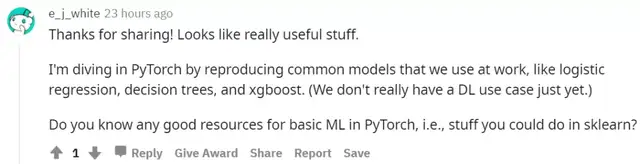 还有用户表示:「谢谢分享,这些看起来非常有用。我通过复现工作中经常使用的常见模型来深入了解 PyTorch,例如逻辑回归、决策树等。(但我们现在还没有使用 DL 的示例。)你们了解 PyTorch 中关于 ML 的一些好的资源吗,比如,你可以在 sklearn 中做的事情?」