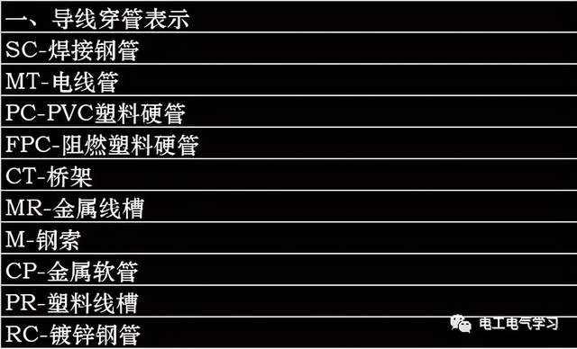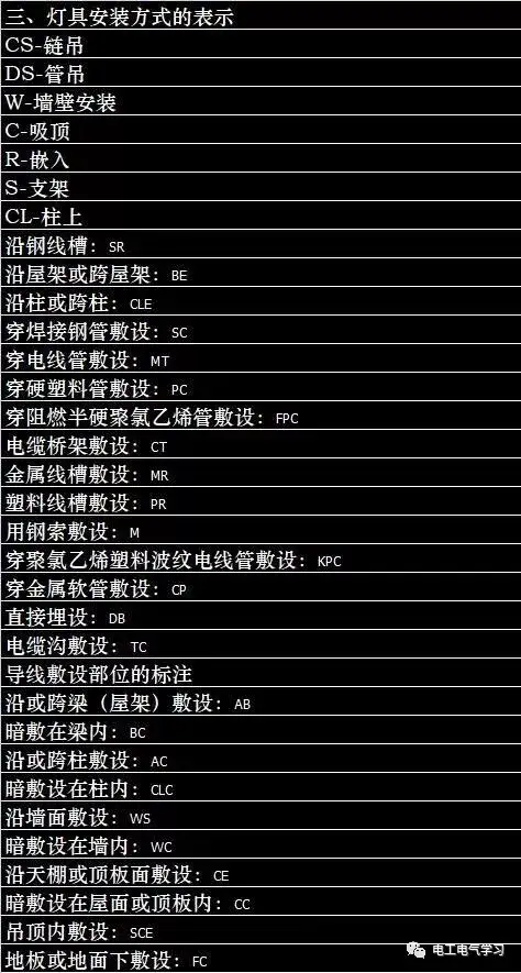 三、电气符号表示方法电气符号的表示都有哪些呢?这里从三个方面和你分享,导线穿管表示、导线敷设方式的表示 、灯具安装方式的表示,具体详细的表示方法如下图: 1、导线穿管表示