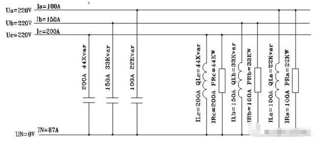 上例中的负荷含有足够多的电感,因此可以取得较好的调整不平衡效果。当负荷的功率因数较高,可以利用的电感较少,而三相电流的不平衡现象又比较严重时,可能达不到完全平衡的目的。但是理论计算与实验的结果都表明:只要负荷中含有电感,就可以在将三相的功率因数均补偿至1的基础上,使三相有功电流的不平衡程度有所减轻,仍然可以达到其他补偿方式所达不到的效果。下面举一例说明这个问题。