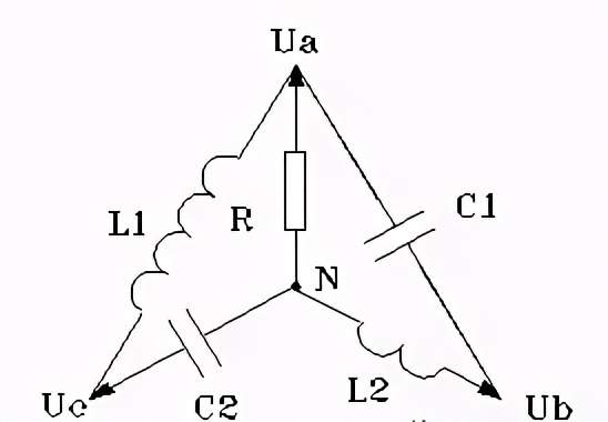 在A相与C相之间接入一个适当的电感L1将A相有功电流的1/3转移到C相,在A相与B相之间接入一个适当的电容C1将A相有功电流的1/3转移到B相,这时电感L1在A相产生的感性无功电流恰好将电容C1在A相产生的容性无功电流抵消掉。在B相与零线之间接入一个电感L2将电容C1在B相产生的容性无功电流抵消掉。在C相与零线之间接入一个电容C2将电感L1在C相产生的感性无功电流抵消掉。于是三相电流完全平衡,并且三相的功率因数全等于1。