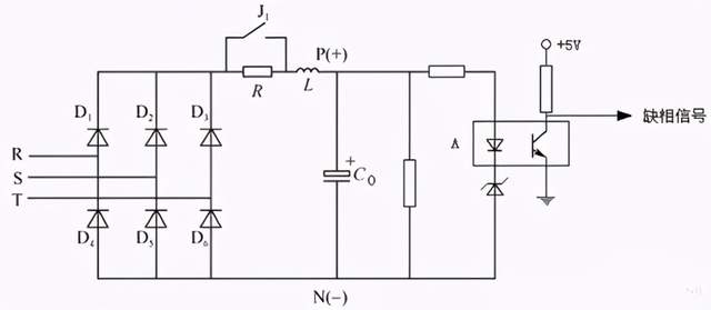 检测变频器输入缺相,最简单的一种方法就是使用硬件检测,如图3所示是其中的一种方法。该电路中C0上的电压高低将反映R、S、T三相输入有无缺相,当发生缺相时,C0上的电压降低,光藕器件将不导通,A点的信号为高电平,对应缺相的发生。